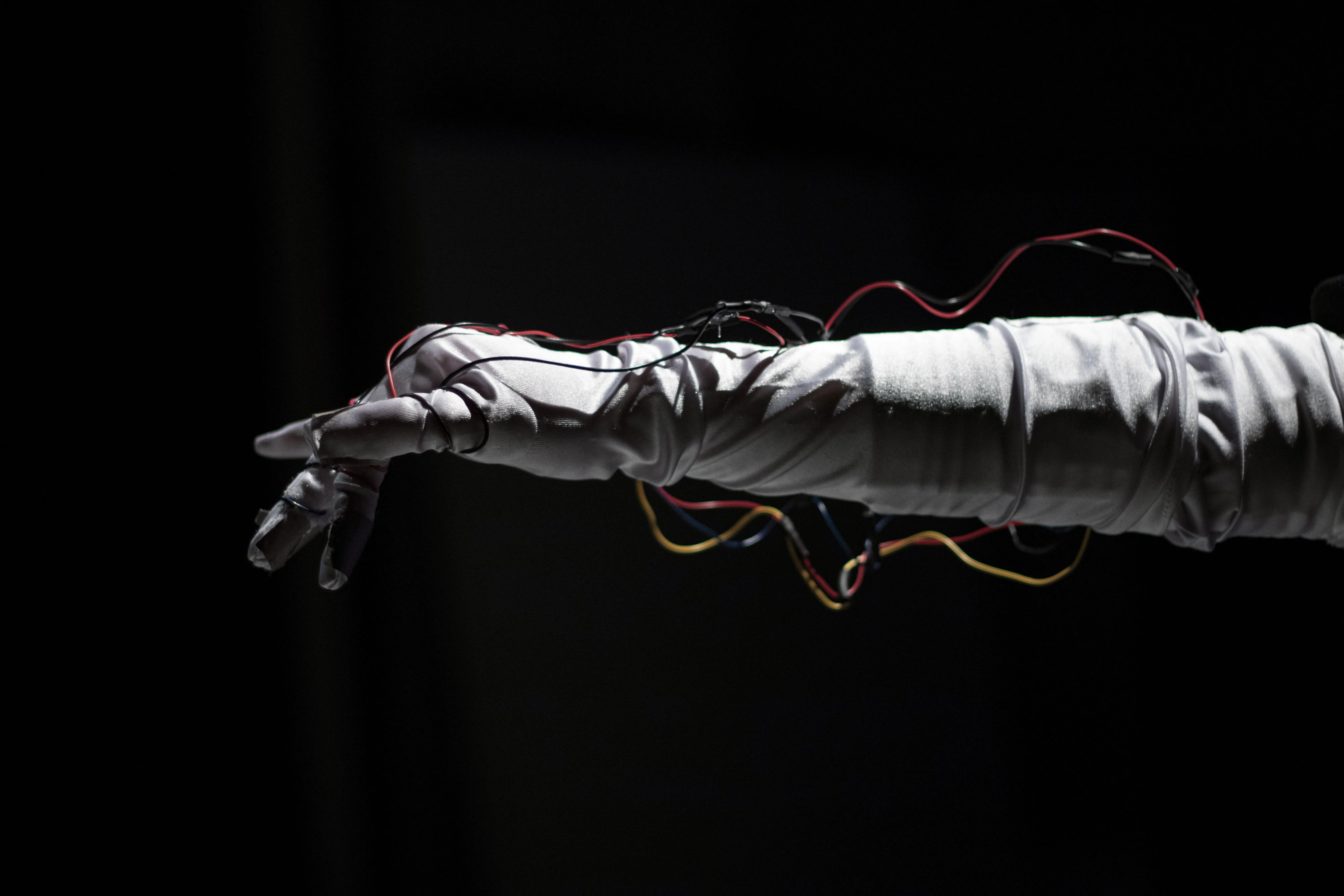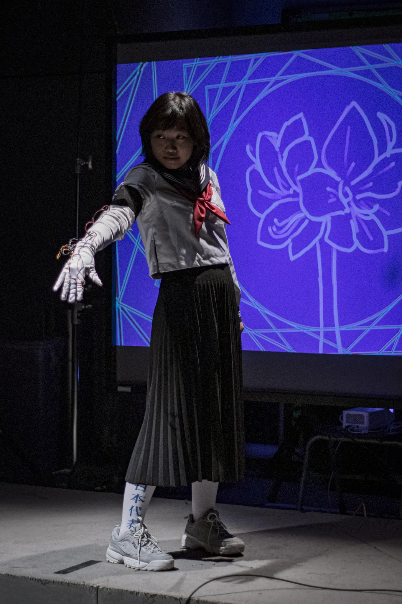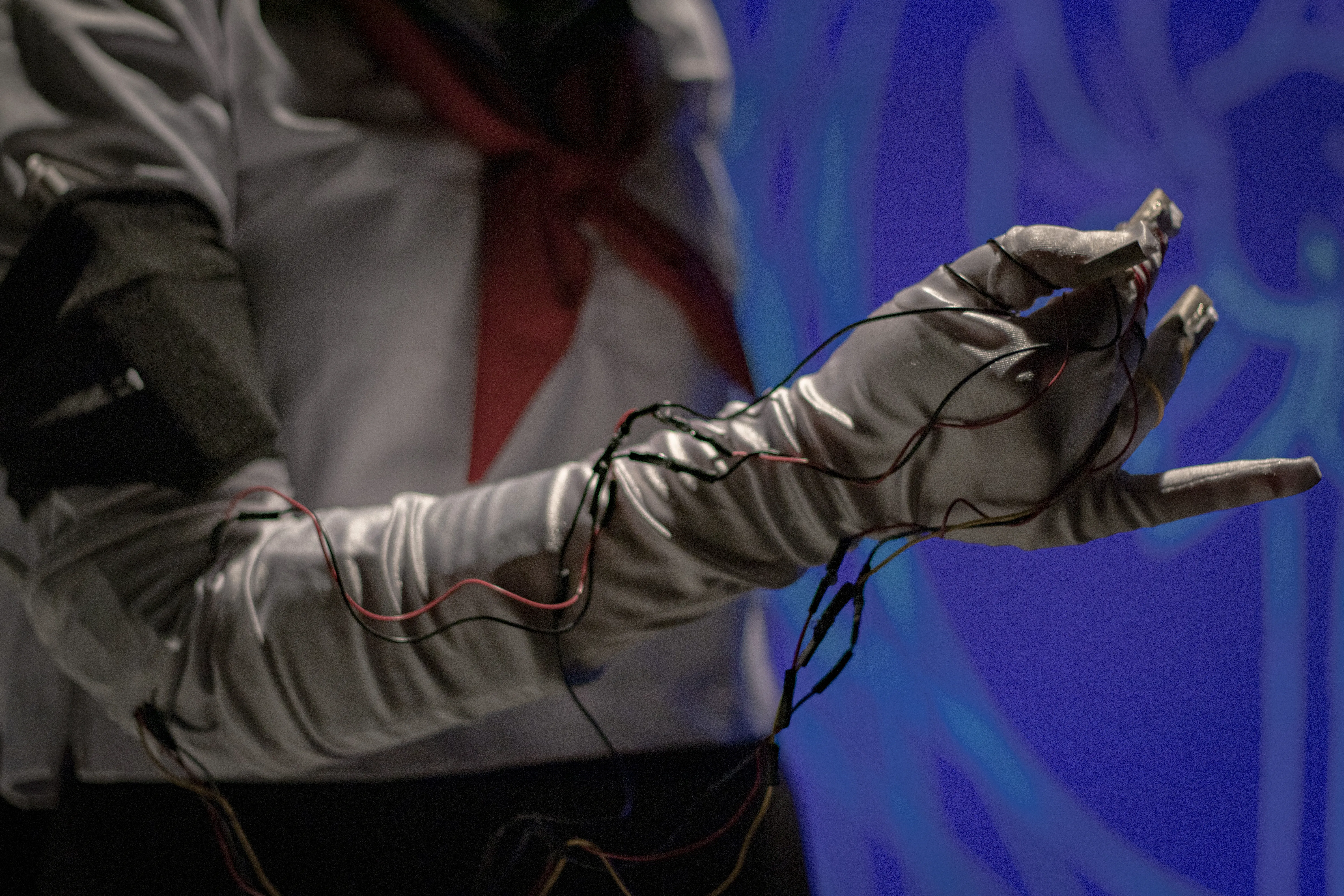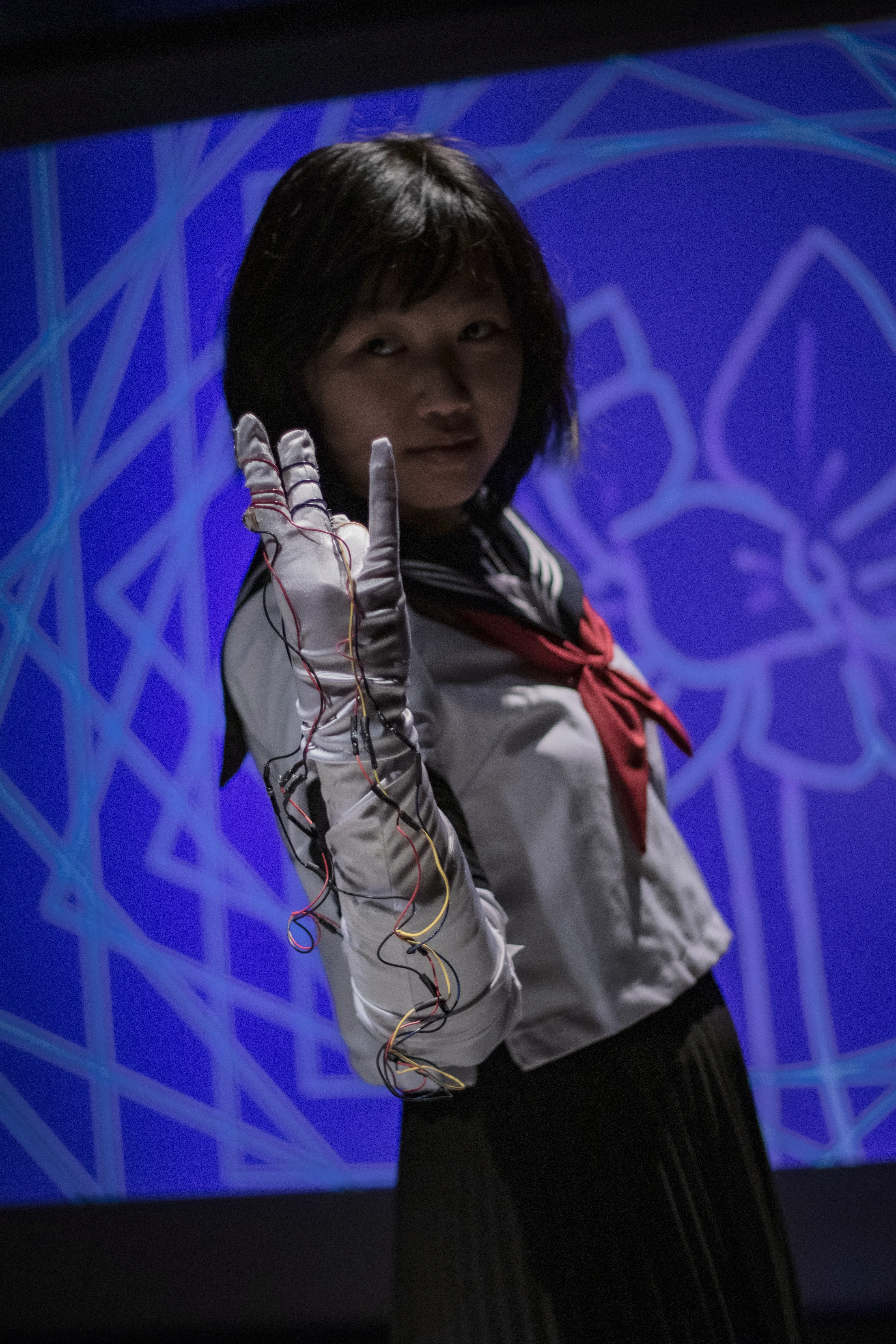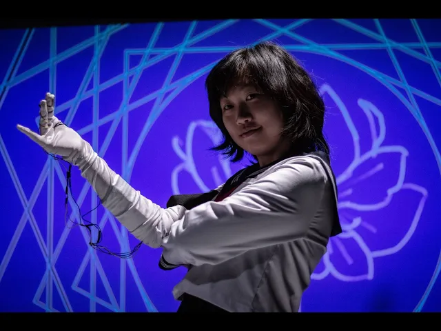 By pressing various fingers to their thumb while wearing the glove, the performer can flash different colours, and even triggering a flower bloom animation.