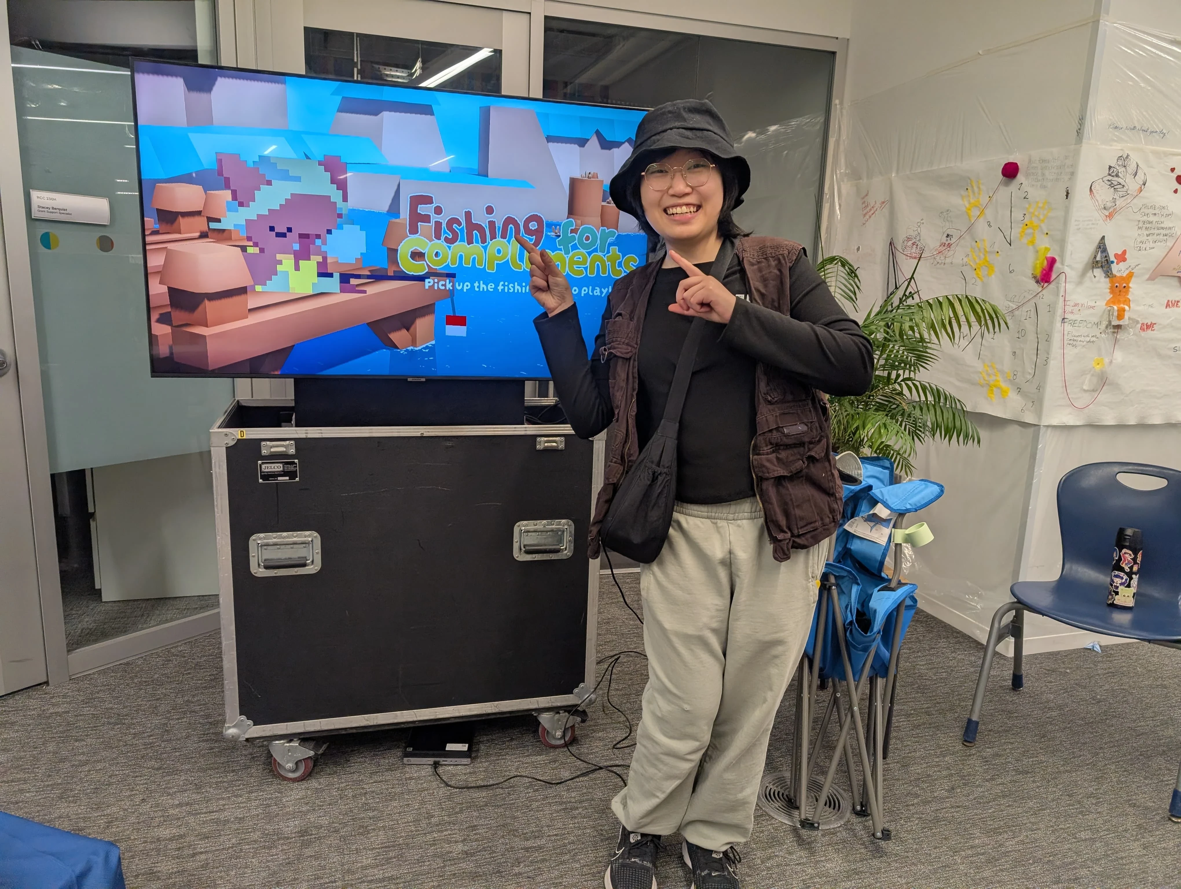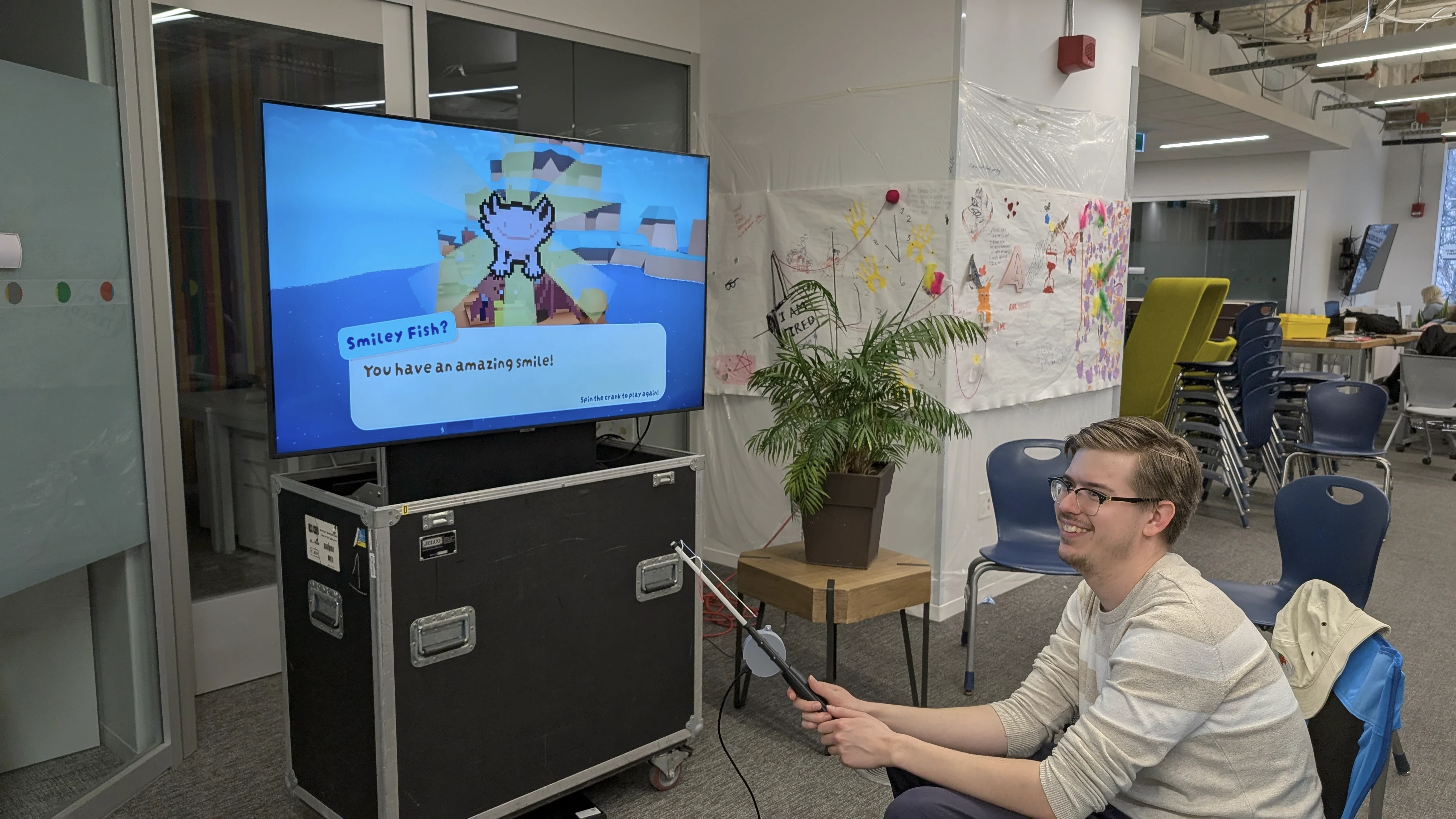 Fishing for Compliments is a fishing mini-game played with an unorthodox controller: a physical fishing rod!