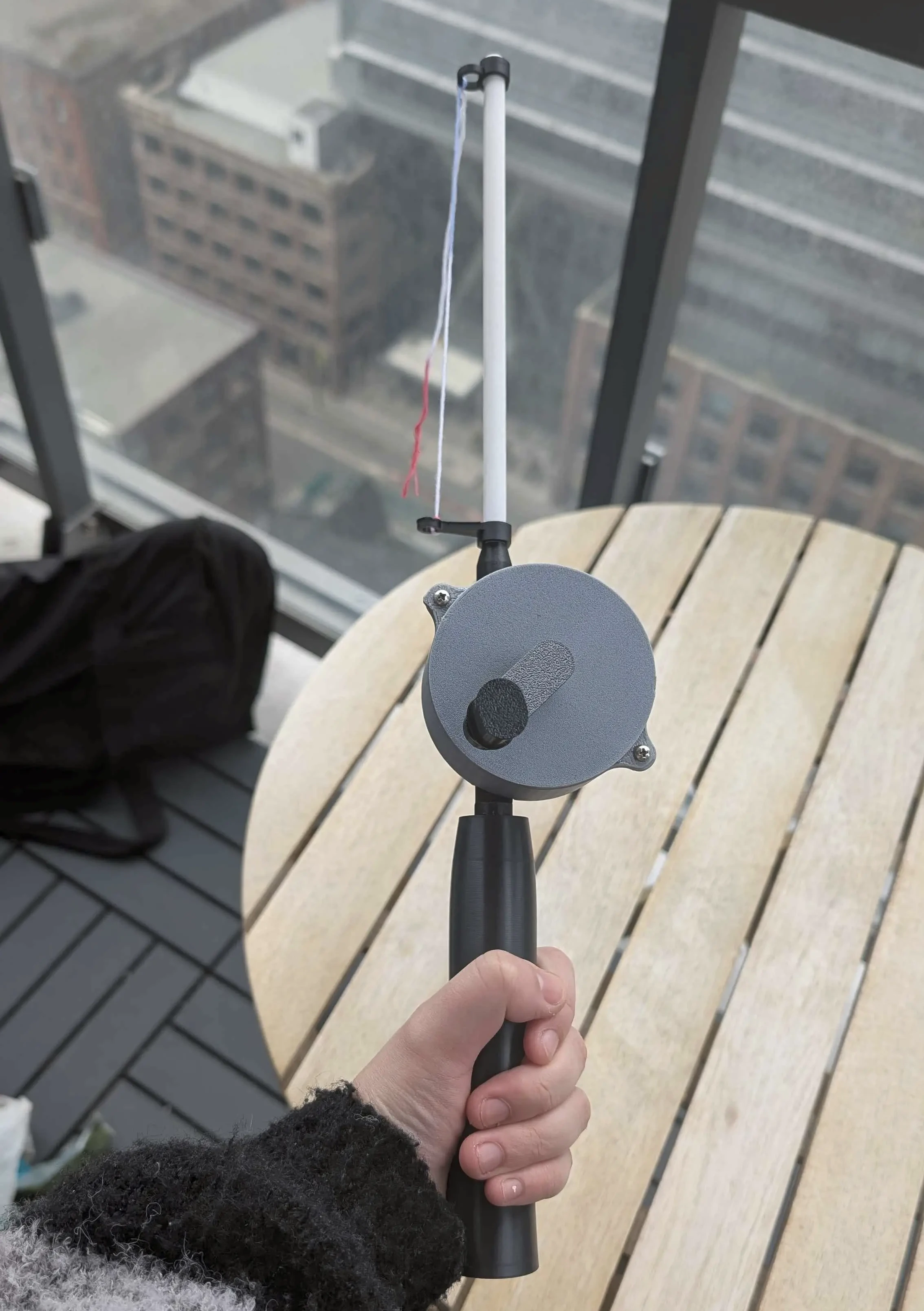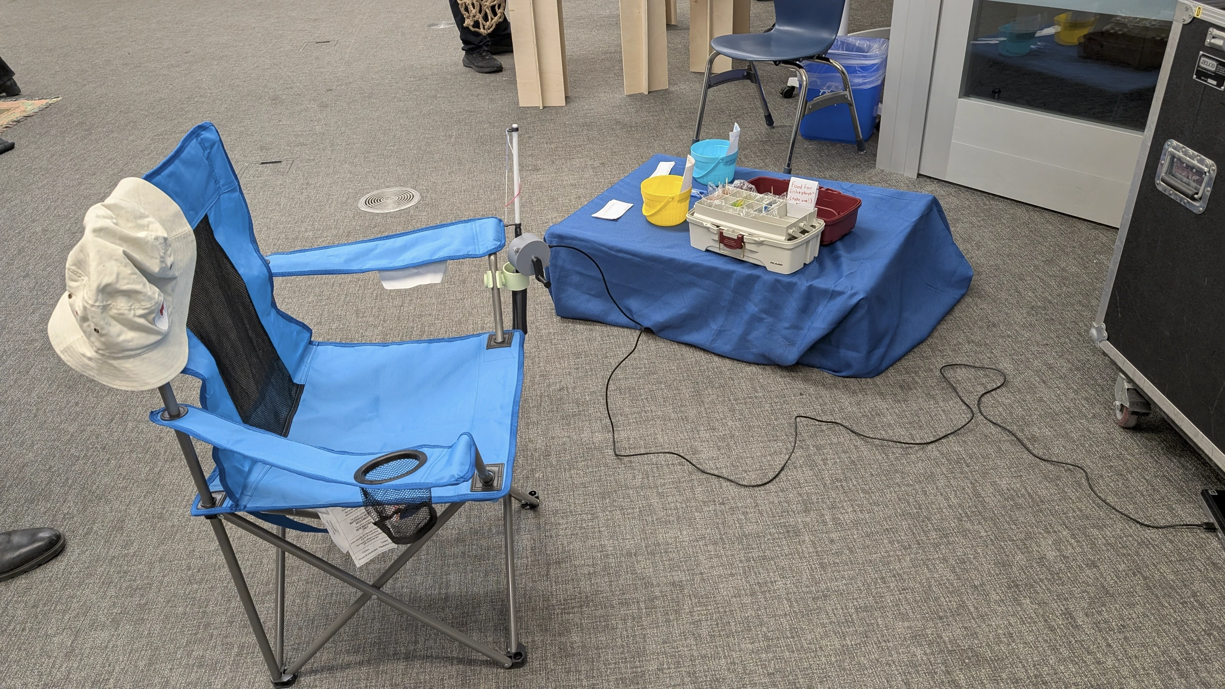 The controller grew from cardboard, to a wand thing, to a real (fake) fishing rod…