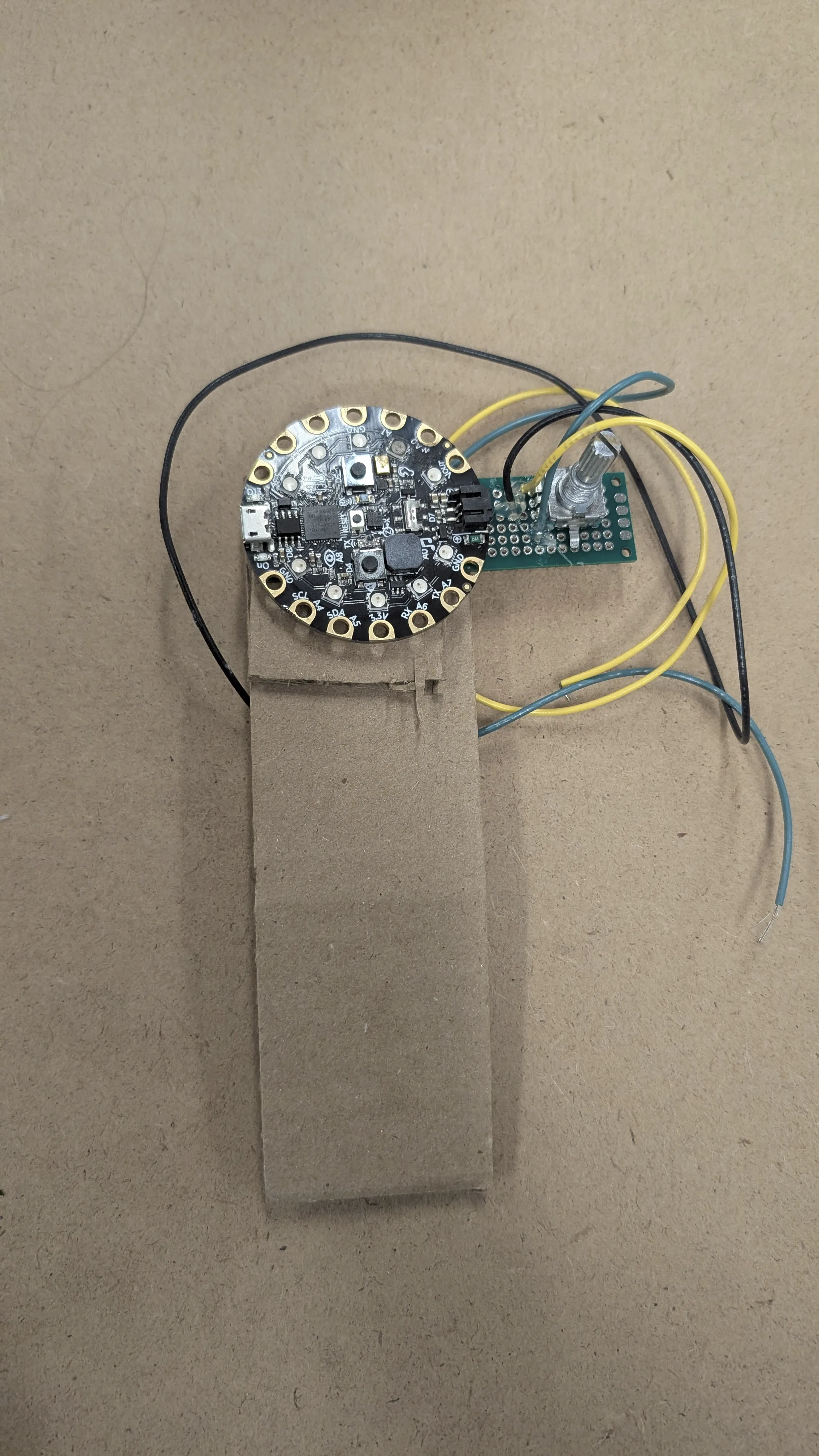 The controller is powered by a Circuit Playground Express, which has a built in accelerometer. It also receives information from a mechanical rotary encoder.